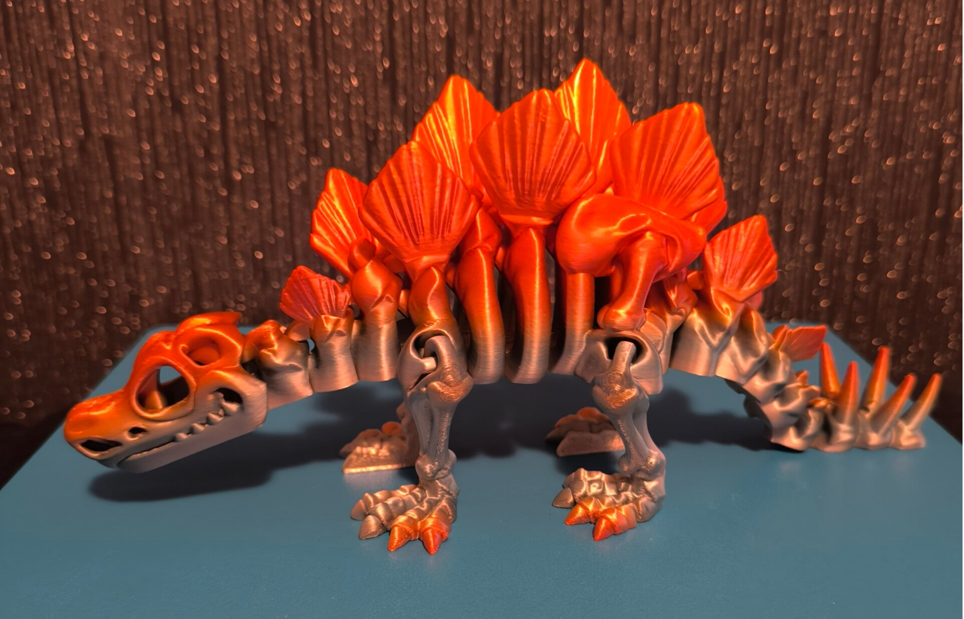 Ich verkaufe einen detailreichen, beweglichen 3D-gedruckten Skeleton Stegosaurus in Multicolor Silk Chroma.
